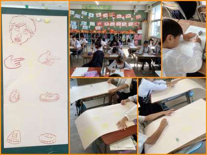 図画工作科では「運動会の旗」と「ハロウィンのぼうし」の振り返りと友だちの作品のよいところを見つけ合いました。素敵なところや工夫しているところなど、たくさん見つけていました。そして次なる作品に取り組む学級も!!画用紙が机からはみ出るほどのBIGな作品ができそうですよ。
