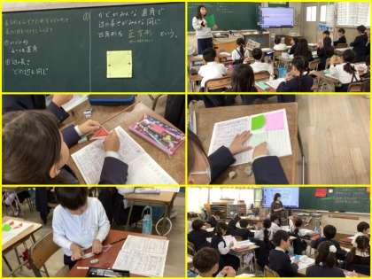 算数科では「長方形と正方形」について学習しています。今日は正方形がどんな形かを折り紙を使って調べました。「4つの辺がすべて同じ長さ」「角が直角」など、作業を通して気づくことができました。