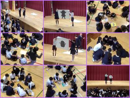 今日は「シルエットクイズ」をしました。さまざまなキャラクターがシルエットになって登場しました。どれも特徴がわかりやすく、すべての班が全問正解できました。集会委員会のみなさん、楽しい時間をありがとう♪