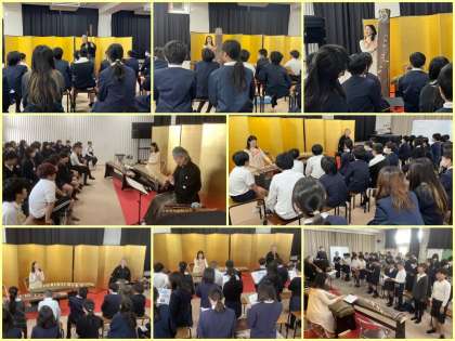 5年 音楽鑑賞(1/15) 公開日 2025/01/15 更新日 2025/01/15 5年 昨日の6年生に引き続き、5年生も尺八と琴の音楽鑑賞を行いました。いつもと違う雰囲気の音楽室に…「わあ!!」と歓声が!!厳かな雰囲気の中、尺八と琴の音色を味わいました♪ 奏者の方々、2日間ありがとうございました。 いいね(0)