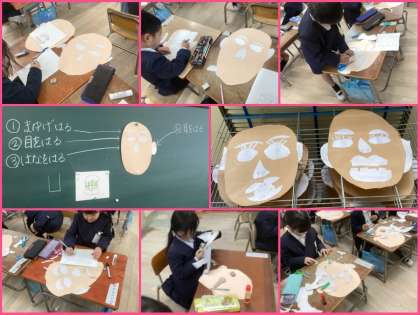 図画工作科では「かみはんが」を制作中。自分の顔を切って貼って表します。歯は細かく切りにくそうでしたが…集中して切っていました!!