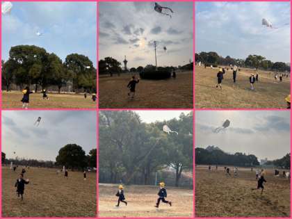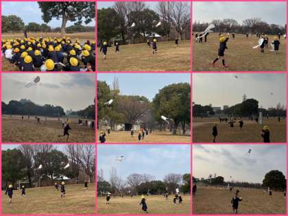 1年 たこあげ(1/24) 公開日 2025/01/24 更新日 2025/01/24 1年 鶴見緑地でたこあげをしました。見本で先生がたこをあげると「わあ!!!」と大歓声♪先生のようにあげようと頑張りました。風を受けて高くあがると大喜びの1年生でした。 いいね(0)