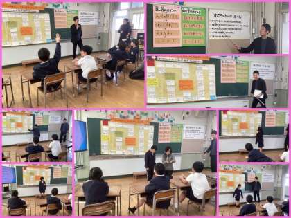 単元「クラスのみんなになかよしタイムをしょうかいしよう」の研究授業を行いました。なかよしタイムの紹介をするにあたって、まずは「すごろくトーク」でスピーチの仕方や友だちのスピーチを聞く練習をしました。すごろくを楽しみながらも、止まったマスのお題について堂々とスピーチができました。たくさんの先生方の参観もあって、はりきって学習に取り組む姿に先生たちも笑顔いっぱいになりました。