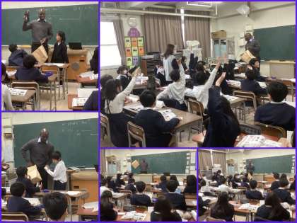 フランク先生と外国語の学習をしました。「What's this?」「It's a 〜.」の学習で、紙袋の中身は何が入っているかを当てるゲームをしました。活動に意欲満々で、たくさん挙手してアピールしていました。