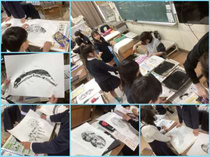 図画工作科では紙はんがを制作しています。版ができたら印刷へ!!真っ黒にインクを塗ってすりすりこすって…。いざ、紙をめくるとき!どんな版画になるのかとドキドキしながらめくっていました。