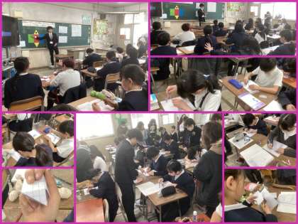 算数科では「角柱と円柱」の学習をしています。今日は三角柱の展開図をかき、実際に組み立ててみました。三角柱は面が何枚あり、重なり合う辺がどこかを考えることで展開図がかける!ことに気づきました。たくさんの先生方が参観されたので緊張していたのか、いつもよりおとなしい5年生でした。
