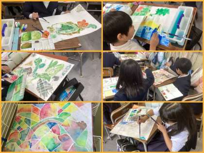 3年 紙版画の背景づくり(2/5) 公開日 2025/02/05 更新日 2025/02/05 3年 紙版画は印刷を終え、今は背景の制作をしています。絵の具を巧みに使って色ぬりをしていました。工夫あふれる紙版画に仕上がりそうですよ〜。楽しみです♪ いいね(0)