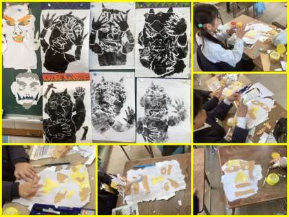 図画工作科では紙版画に取り組みます。今年は「心の中の鬼退治」で自分の心の中に潜む「鬼」を考えて制作しています。怒っている表情や泣き顔、困っている表情の鬼などを版に表していました。活動を終える前には「ゴミ退治だ!!」と言って、机や床に落ちている紙くずを丁寧に掃除していました。ゴミ退治、大成功です♪