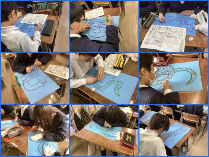5年 木版画に挑戦中!(2/17) 公開日 2025/02/17 更新日 2025/02/17 5年 図画工作科では木版画に取り組んでいます。今年の干支「巳」を描き、模様をゼンタングルで表すようです。刷り上がりが今から楽しみです♪ いいね(0)