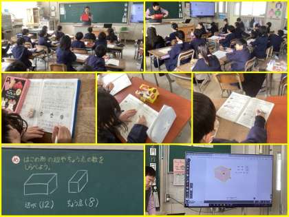 2年 はこの形を調べよう(2/17) 公開日 2025/02/17 更新日 2025/02/17 2年 算数科では「はこの形」について学習しています。今日は「はこの形や辺や頂点の数を調べよう」というめあてのもと、自分が持ってきた箱を使って辺や頂点の数を調べました。調べた結果が合っているとガッツポーズで喜んでいる姿が微笑ましかったです。 いいね(0)