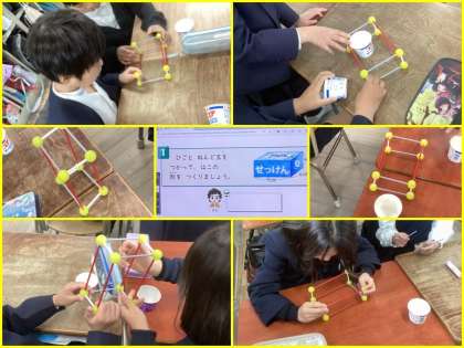 はこの形を詳しく学習し、実際に模型を作りました。「頂点は8こ、同じ長さの辺は4つずつだから…」と言いながら、隣の席の友だちとペアになって作りました。困ったときには近くの友だちが助けに来て…どのペアも作ることができました♪
