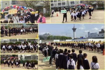 1年生の思いが天に届いたのか、青空の下で対面式を行うことができました。2年生から6年生の大きな拍手に誘われ堂々と入場しました。校長先生のお話や児童代表のことばを目を見開いて聞いていました。そして…600人を前に、返事も言葉も元気いっぱい伝えることができました。可愛い1年生の姿に誰もがにっこり、とても温かい対面式となりました。