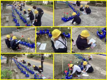 生活科の時間にシューリップを観察しました。細かい部分までよく見て、丁寧に記録していました。昨日の雨でチューリップの花の中に海水が溜まっていましたね。