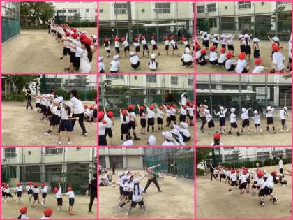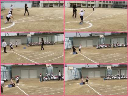 1年生もソフトボール投げをしました。はじめに投げる練習をしました。投げる時のフォームはとてもかっこよかったです。いざ、本番。ボールがてのひらより大きいので投げにくそうにしていましたが、練習したポーズで校舎めがけて投げました。