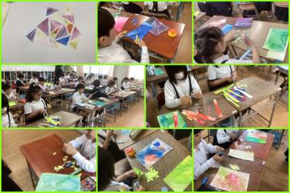 3年 三角に切って…(4/23) 公開日 2025/04/23 更新日 2025/04/23 3年 色付けした画用紙を細長く切り、三角に切っています。これをお手本のように並べていきます。細かい作業ですが、集中して取り組んでいる3年生です♪ いいね(0)