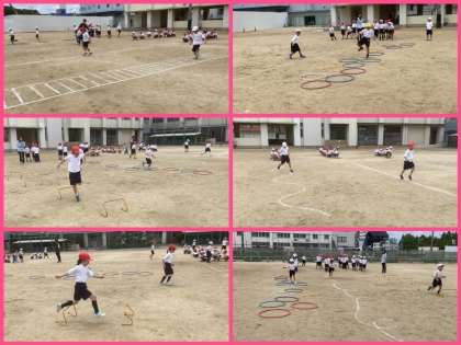 運動場でいろいろなかけっこをしました。フープやミニハードルの上を跳び越えたり、白線の上を走ったり、とっても楽しいかけっこでした。