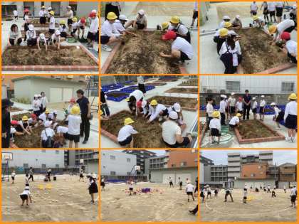 今回は野菜の苗植えと玉入れをしました。新しくなった学習園に夏野菜の苗を優しく植えました。そして毎年大収穫となるさつまいもの苗も植えました。「大きく育てパワー」を送りながら、水やりも頑張ります。