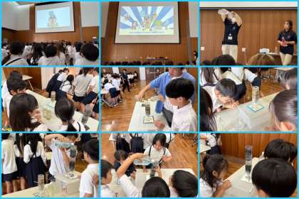 浄水の実験をしました。粒状活性炭の力に驚き!!青い水が無色透明のきれいな水に変わりました♪