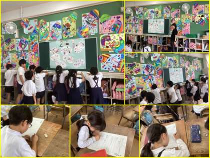 2年生の教室には、図画工作科で制作した「ふしぎなたまご」が掲示されています。世界に一つだけのたまごは、創造力があふれ、見る人を惹きつけます。今日の鑑賞会では、自分の作品にタイトルをつけたり、友だちの作品のすてきなところを見つけたりしました♪