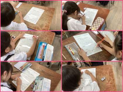 1年生がとても集中して手紙を書いていました。その手紙には感謝の気持ちがたくさん込められていました。色も丁寧に塗っていました。さあ、この手紙は誰に渡されるのでしょう。それは…お楽しみです♪