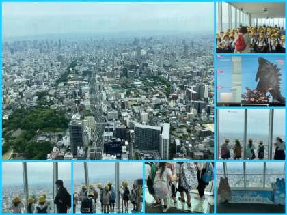 エレベーターの速度に驚くと同時にエレベーター内が宇宙空間のようで、その美しさにも目を奪われていました。60階に到着すると…壮大な景色が目に飛び込んできました。興奮MAX!早く見学したい様子でした。(ちなみにハルカスの高さはゴジラの高さと同じのようです)