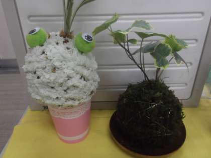 現在職員室に、苔玉が飾られています。6月22日にPTA成人教育講習会があり、その時に作成したものが置かれています。先生たちは足を止め、苔玉に癒されています。
