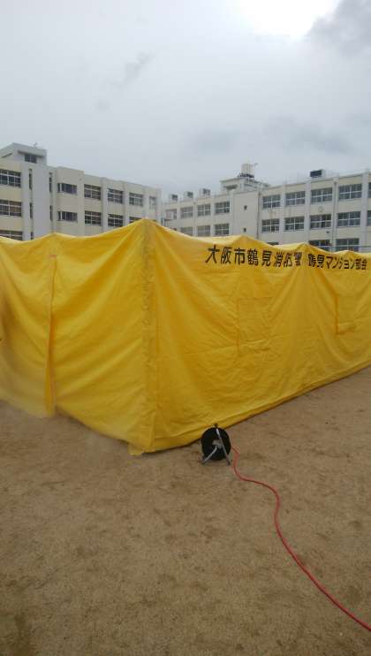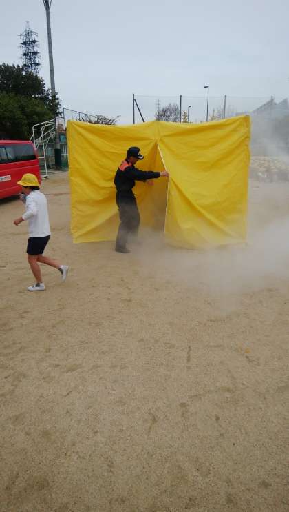 写真は5、6年生の児童が体験した、煙体験です。白い煙は、植物性の油でできているので、人体に害はないとのことです。