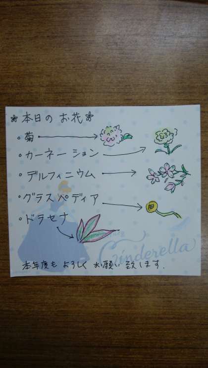 写真は、今年度初の今月のお花です。今年も校長室に飾られています。