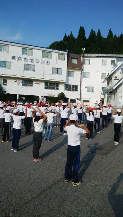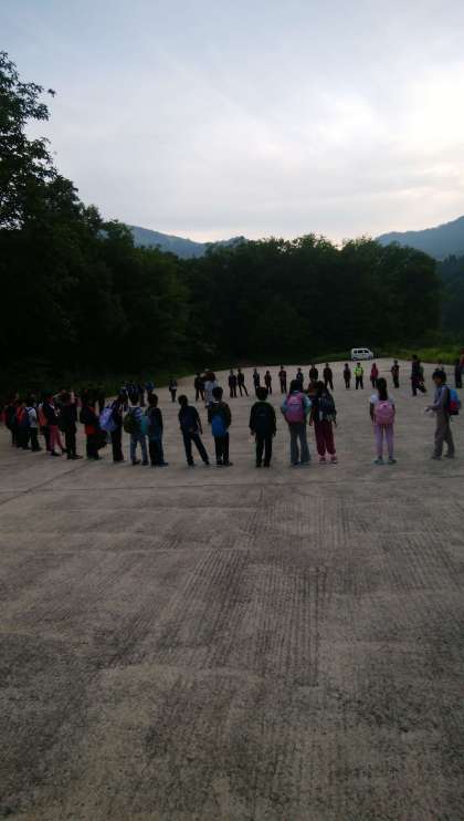 昨晩のキャンプファイヤーの様子(まだ、火はついてませんが・・・)と今朝の「朝のつどい」の様子です。青空がひろがっています。涼しく、良いお天気です。