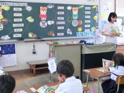 写真は、栄養教諭の田坂先生と1年生が「すききらいしないで たべよう!」をテーマに学習をしている様子です。