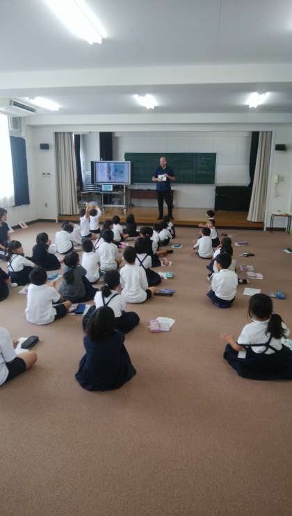 場所は新館4階の第2音楽室です。1年生にとっては普段あまり使わない場所であるのと、絨毯の上での授業(机・椅子はなし)になるので、わくわくした気持ちでいたと感じています。外国人の英語の先生が話すネイティブな英語を、子どもたちは楽しそうに繰り返しマネをしていました。