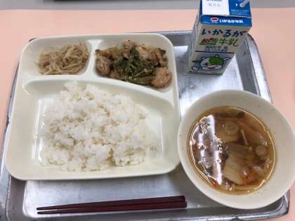 今日の給食献立をお伝えします。「鶏肉のごまだれ焼き・ソーキ汁・もやしのしょうがじょうゆあえ」です。