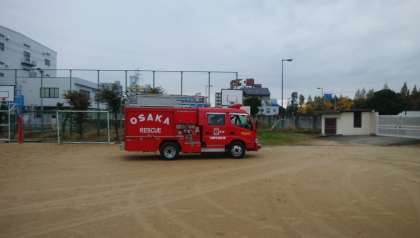 各教室から迅速に避難することができました。鶴見消防署の隊員の方も消防自動車で駆けつけ、水消火器による消火活動を指導してくださいました。