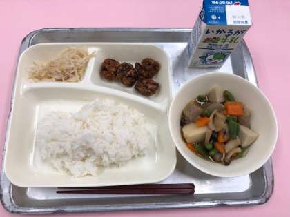 その他メニューは「さといもと野菜の煮もの・もやしのゆずの香あえ・ごはん・牛乳」です。