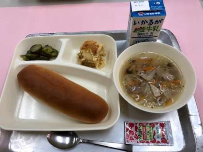 「ツナポテトオムレツ・スープ・きゅうりのバジル風味サラダ・黒糖パン・牛乳」洋風の献立です。