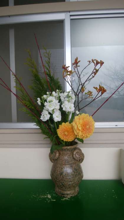 ダリアのオレンジ色がとてもきれいです。学校に立ち寄られた際はぜひ見ていただけたらと思います。