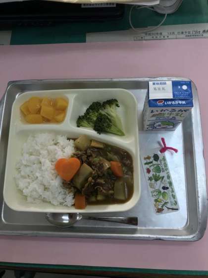 今日のカレーは、冬野菜のカレーです。献立を紹介しますと、「冬野菜のカレーライス・ブロッコリーのサラダ・黄桃・牛乳」です。
