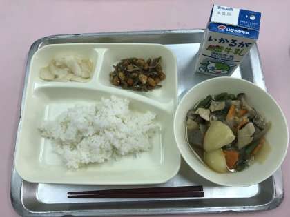 今日の献立は、「鶏肉と野菜の煮物・じゃこ豆・かぶのゆず風味・ごはん・牛乳」です。噛みごたえのある、かみかみ給食です。しっかり噛んでいただきましょう。