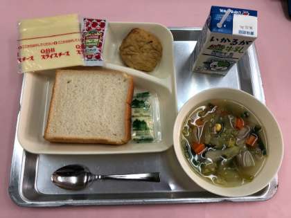 今日の献立は、「とうふハンバーグ・スープ煮・スライスチーズ・食パン・牛乳」です。とうふハンバーグはケチャップをつけていただきます。