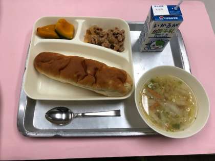 今日の献立を紹介します。「豚肉のケチャップソテー・白菜のスープ・焼きかぼちゃ・おさつパン・牛乳」です。