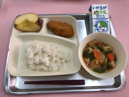 今日の給食は、「たらのフライ・あつあげと野菜の煮もの・りんご・ごはん・牛乳」です。2学期の給食は、今日が最後です。3学期の給食は、1月8日からです。さて、メニューは何かな?
