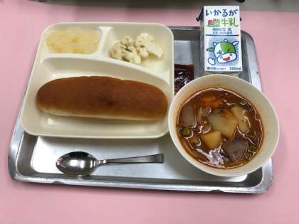 今日は洋風のこんだてです。「ビーフシチュー・カリフラワーのピクルス・和なし(かんづめ)・パン・牛乳」寒い日に、あったかーいシチューは本当にうれしい・おいしい!!