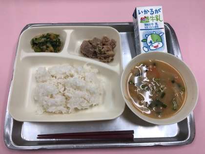 今日の献立は、「豚肉のごまだれ焼き・みそ汁・きくなとはくさいのおひたし・ごはん・牛乳」です。具だくさんのみそ汁とやさしい味わいのおひたしがおいしかったです。
