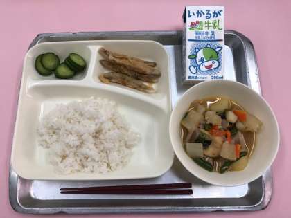 今日の献立は、「きびなごてんぷら・一口がんもとだいこんの煮もの・あっさりきゅうり・ごはん・牛乳」です。やさしい味わいの和の献立です。