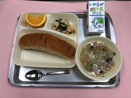 今日の献立は、「えびとチンゲンサイのいためもの・中華がゆ・はっさく・おさつパン・牛乳」です。肉団子も入った、ボリュームたっぷりの中華がゆです。