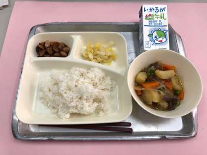 今日の献立は、「肉じゃが・はくさいのゆず風味・とら豆の煮もの・ごはん・牛乳」です。今日はとら豆がつかわれていますが、給食には10種類ほどの豆が登場します。