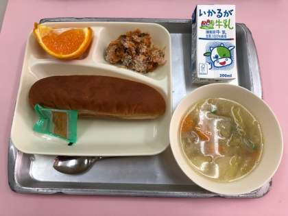 今日の献立は、「とうふのミートグラタン・押し麦と野菜のスープ煮・デコポン・コッペパン・牛乳」です。たんぱく質、カルシウムたっぷりの大豆を使用したとうふのミートグラタンです。