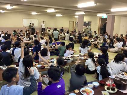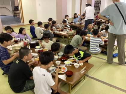 今日の献立はハンバーグです!しっかり食べて、次の活動「キャンプファイヤー」のエネルギーにしよう♪
