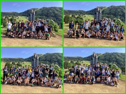 鉢伏高原モニュメントの前で集合写真!!登山は中腹まで登っているようです。あとひといき、頑張れ〜♪