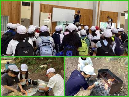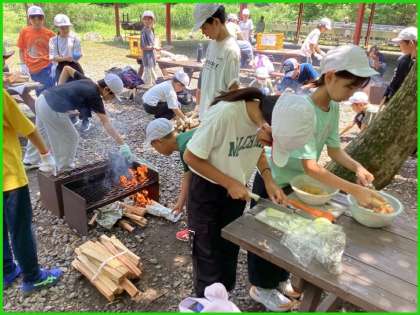 カレー作りをしています。昨日のオリエンテーリングで食材はばっちりGET!あとは班で協力して作るのみ。火起こしも頑張っています。おいしいカレーライスが完成しますように♪